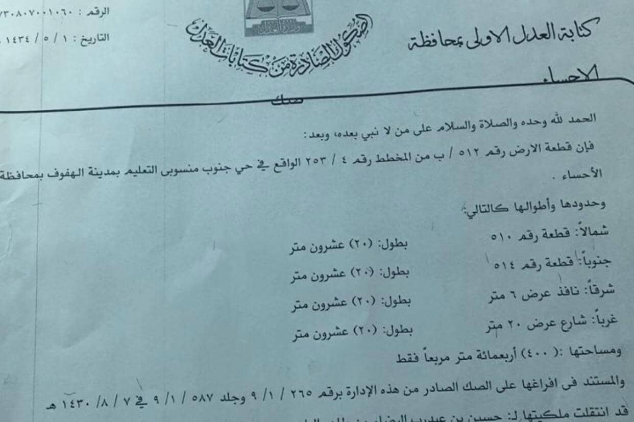 ارض سكنية بحي المعلمين الموقع حي جنوب منسوبي التعليم مخطط رقم 253/4 قطعة رقم 512 / ب المساحة 400 متر مربع شارع عرض 20متر غربا بطول 20 متر وشرقا عرض 6 متر بطول 20 متر وجنوبا بطول 20 متر وشمالا بطول 20 متر السعر مسيوم 280 الف