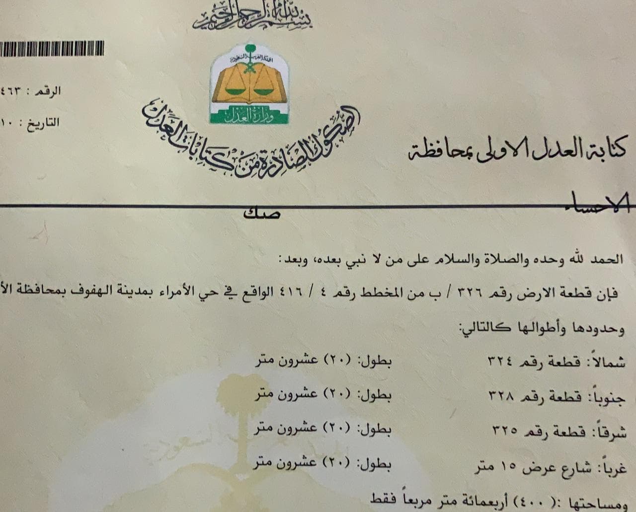 مخطط رقم 4 / 416 قطعة رقم 326 / ب المساحة 400 متر مربع ( شمالا : قطعة مجاورة رقم 324 بطول 20 متر ) ( جنوبا : قطعة مجاورة رقم 328 بطول 20 متر ) ( شرقا : قطعة مجاورة رقم 325 بطول 20 متر ) ( غربا : شارع عرض 15 متر بطول 20 متر ) السعر على السوم