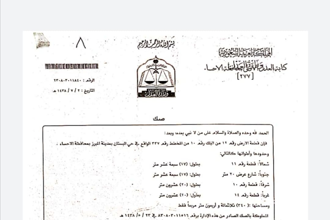 ارض حي البستان المبرز مخطط رقم ٣٣٧ رقم الارض ١٢ شارع جنوبًا ٢٠ مترًا مساحه ٣٤٠ مترًا المساحة السعر