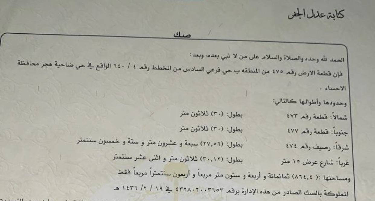 ارض للبيع ضاحيه هجر الحي السادس رقم القطعه 475 ب المساحة 864 على السوم السعر