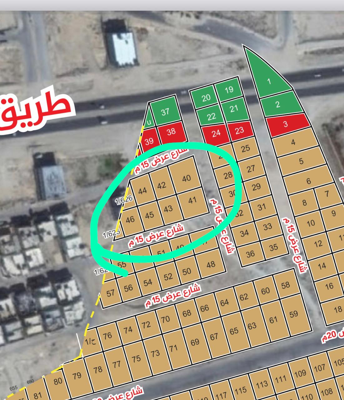 قطعه رقم ( 40 ) مساحه 826.95 متر مربع شارع 15 وقطعه رقم ( 41 ) مساحه رقم 645.5 متر مربع وقطعه رقم ( 42 ) مساحه 587 متر مربع شارع 15 وقطعه رقم( 43 ) مساحه 500 متر مربع وقطعه رقم (44) مساحه رقم 549.7 شارع 15 وقطعه رقم (45 ) مساحه 500 متر مربع وقطعه رقم ( 46 ) مساحه 484.25 متر مربع المساحة السعر سعر المتر 1400 ريال لجميع القطع