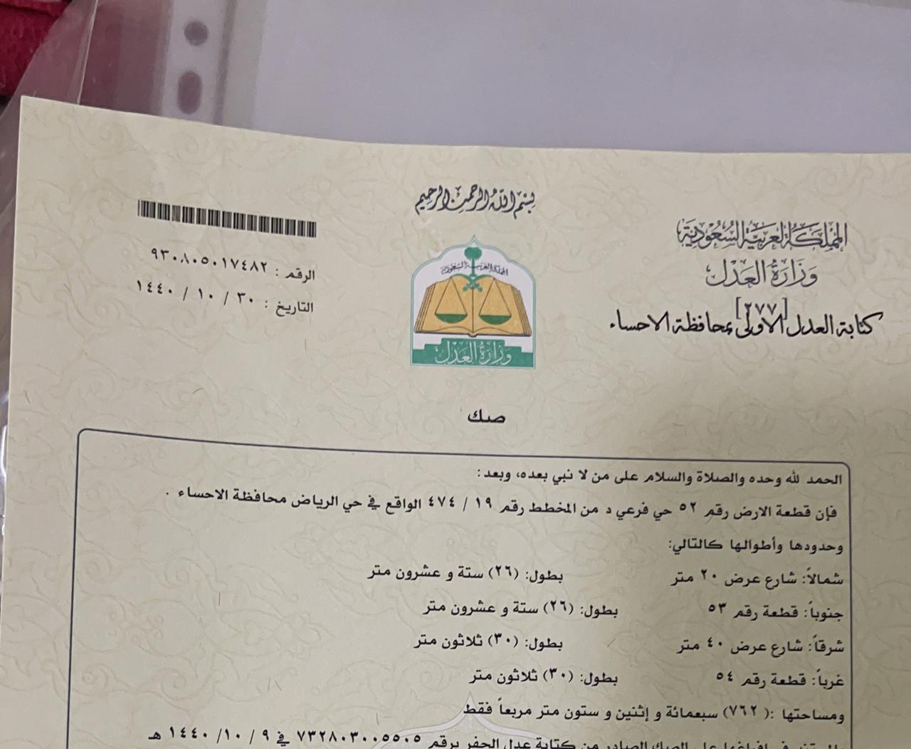 قطعه رقم 52 حي فرعي ( د ) من المخطط رقم 19/474 الواقع في حي الرياض بالاحساء المساحة 762 متر مربع شرقا : شارع عرض 40 متر بطول 30 متر وشمالا : شارع عرض 20 متر بطول 26 متر وجنوبا : قطعه رقم 53 بطول 26 متر وغربا : قطعه رقم 54 بطول 30 متر السعر على السوم